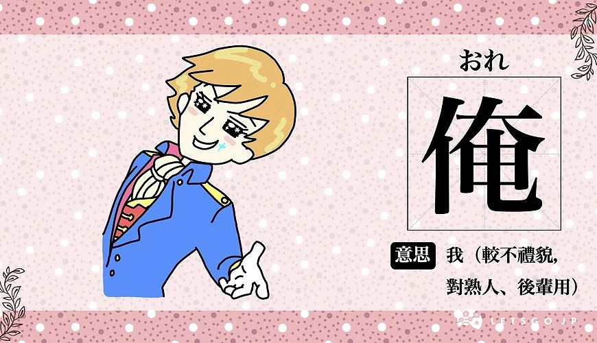| 俺 | 男性私下自称 适用与平辈、后辈对话场合礼貌 |