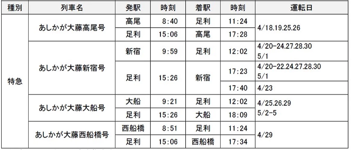 | たにがわ11号 | 东京 06:00 | GALA 汤泽 07:12 | 3/20 | 东京 6 点发车,直达 GALA 汤泽的临时列车 |